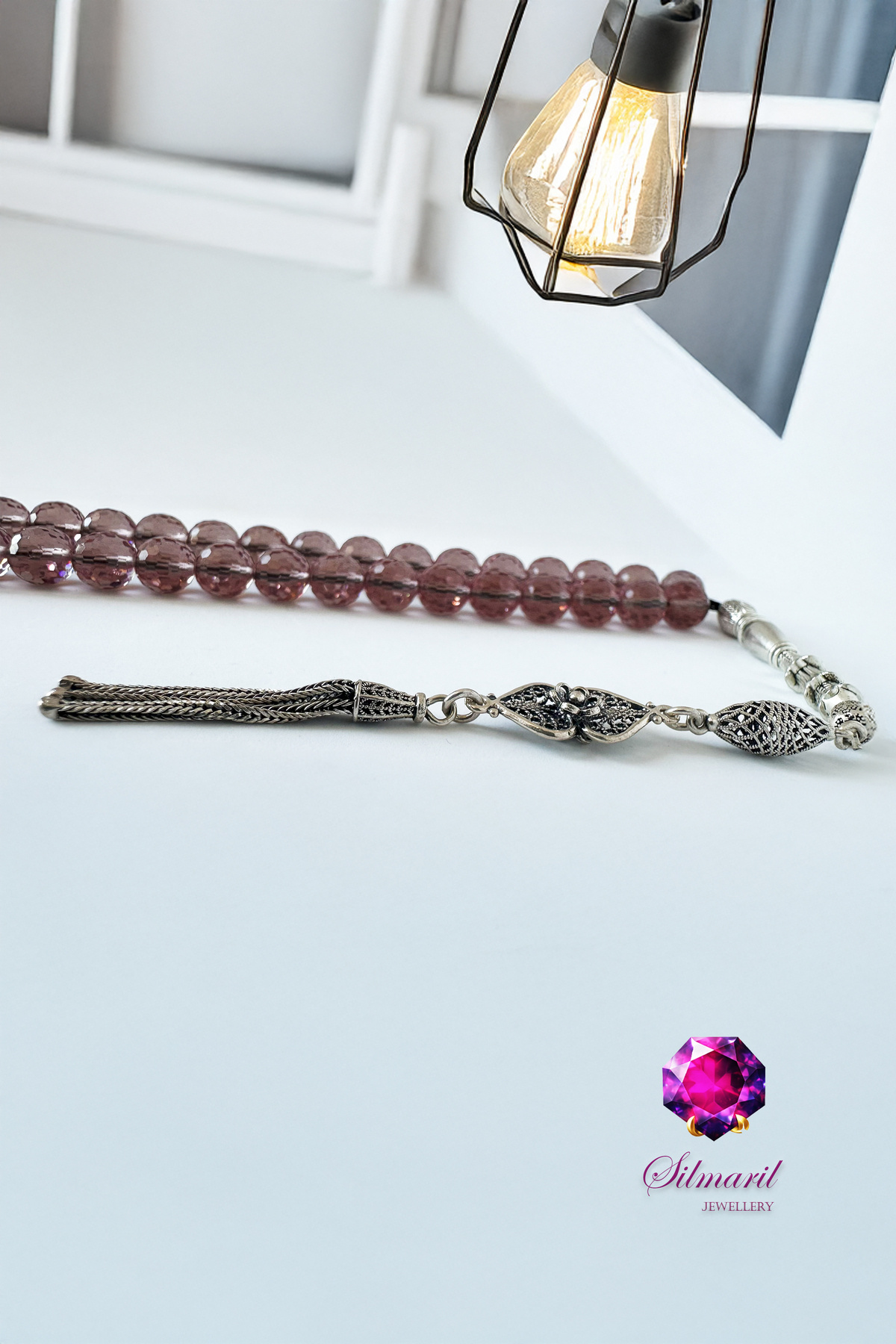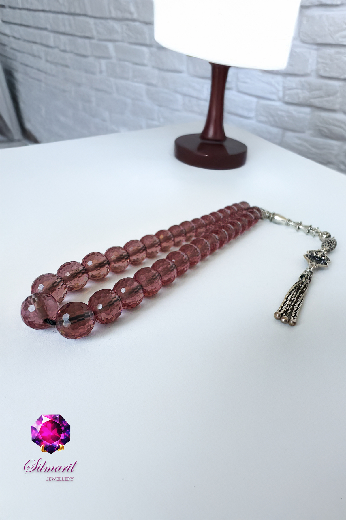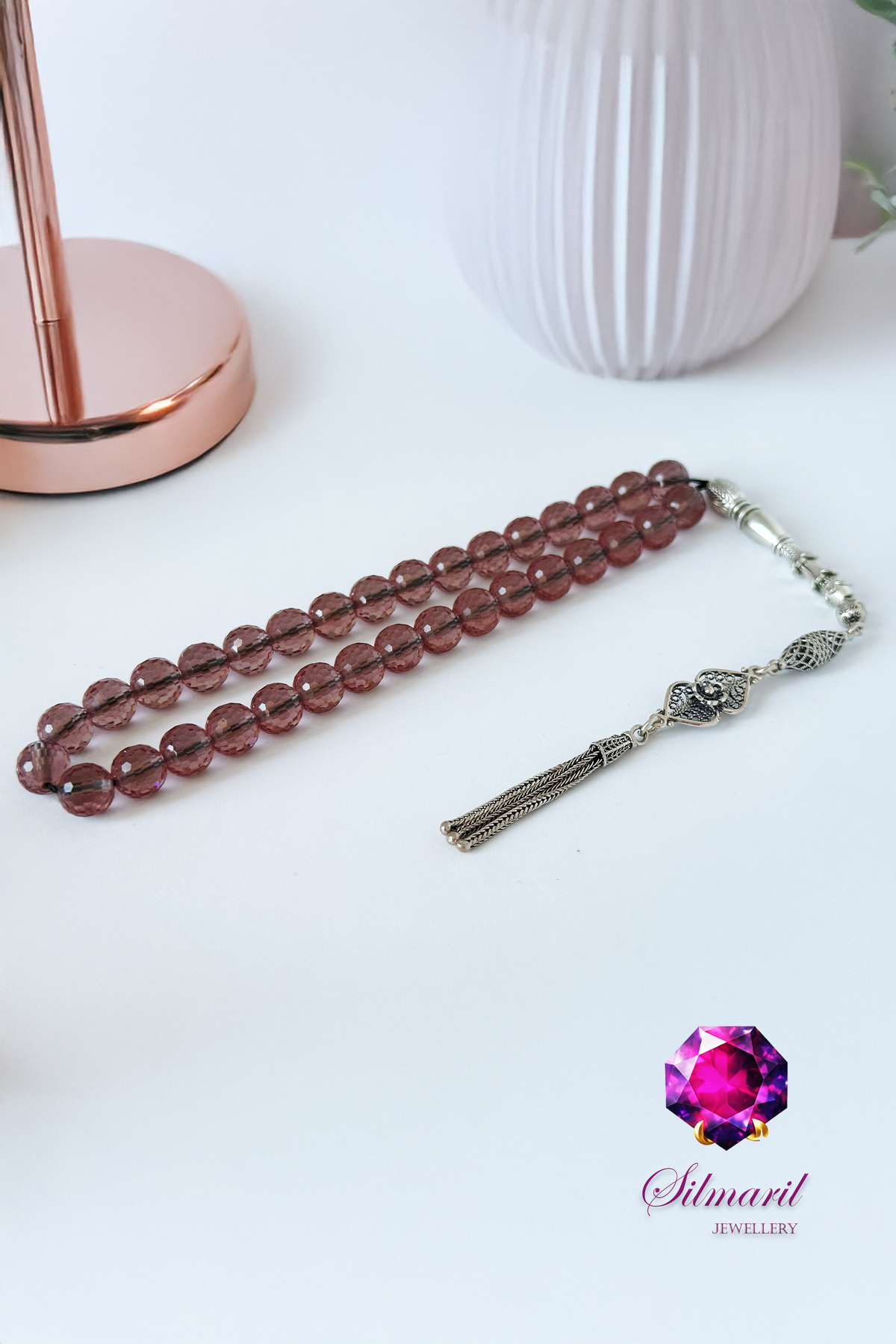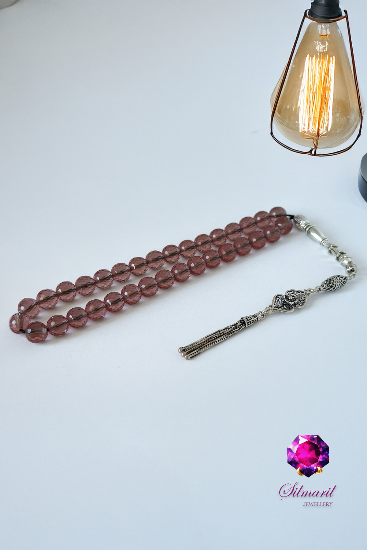 Renk Değiştiren Güzellik: Bu özel taş, loş ışıkta açık şeftali ve kehribar tonlarında parlar; gün ışığında ise pembemsi ve lavanta tonlarına bürünerek adeta ruhunuzu yansıtır. Her bir taşta saklı olan bu gizemli değişim, tespihinizi her ortamda farklı bir hikayeye dönüştürür.