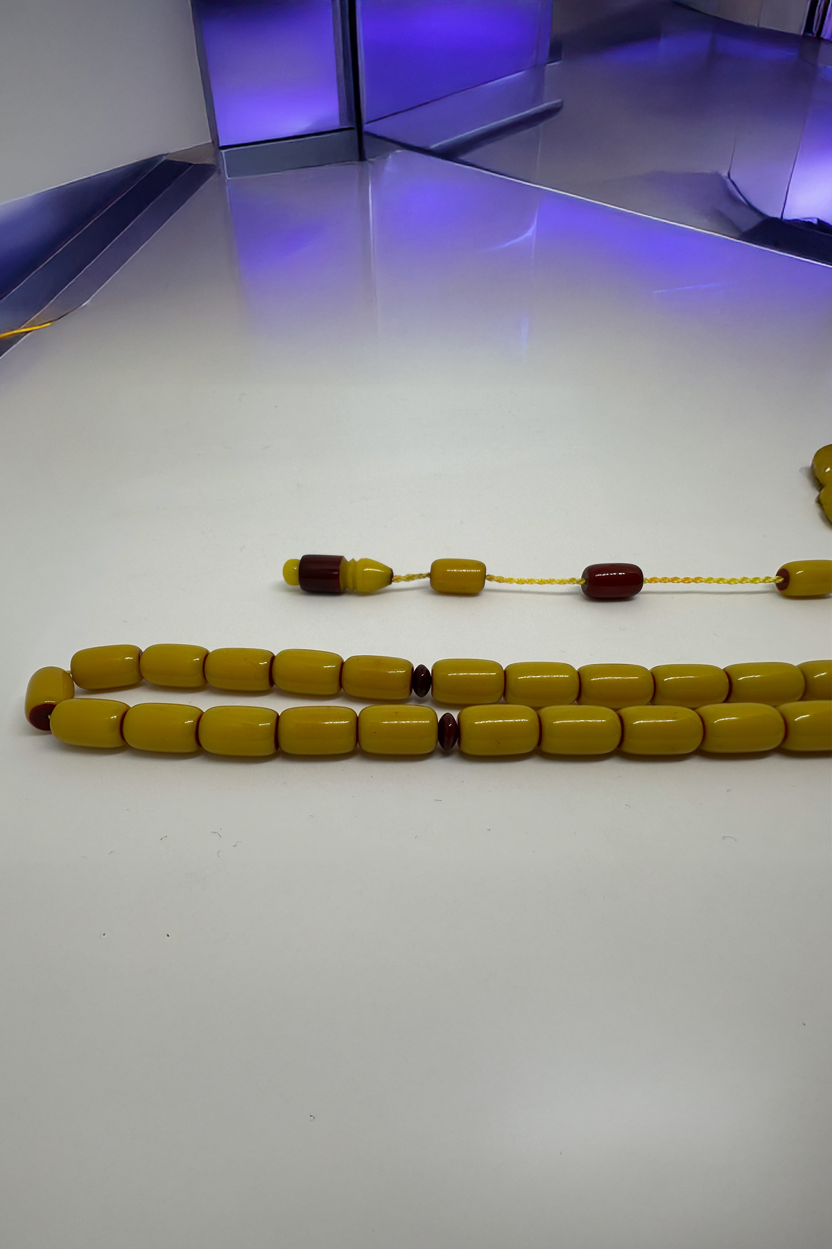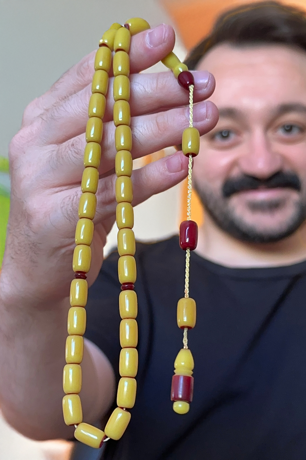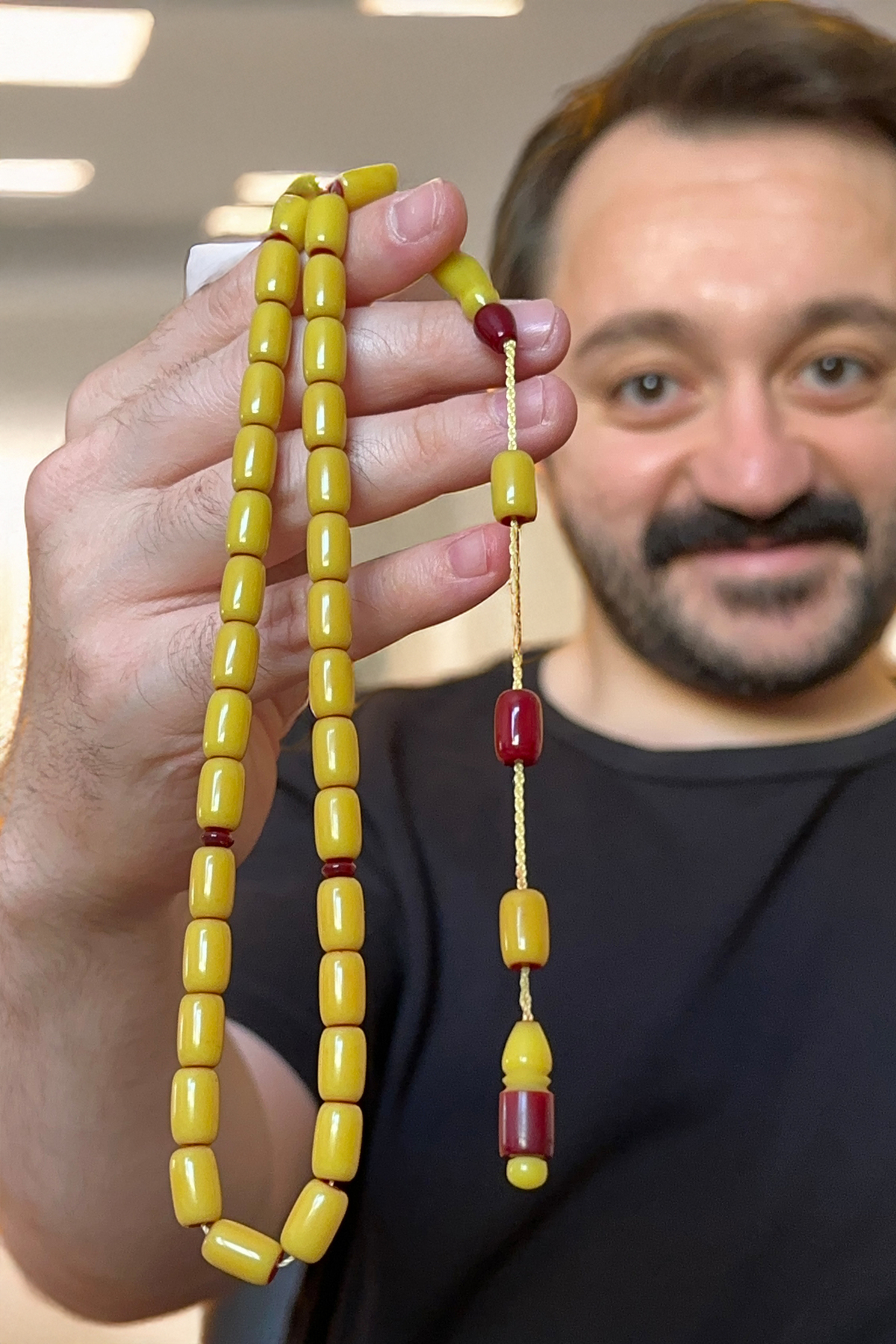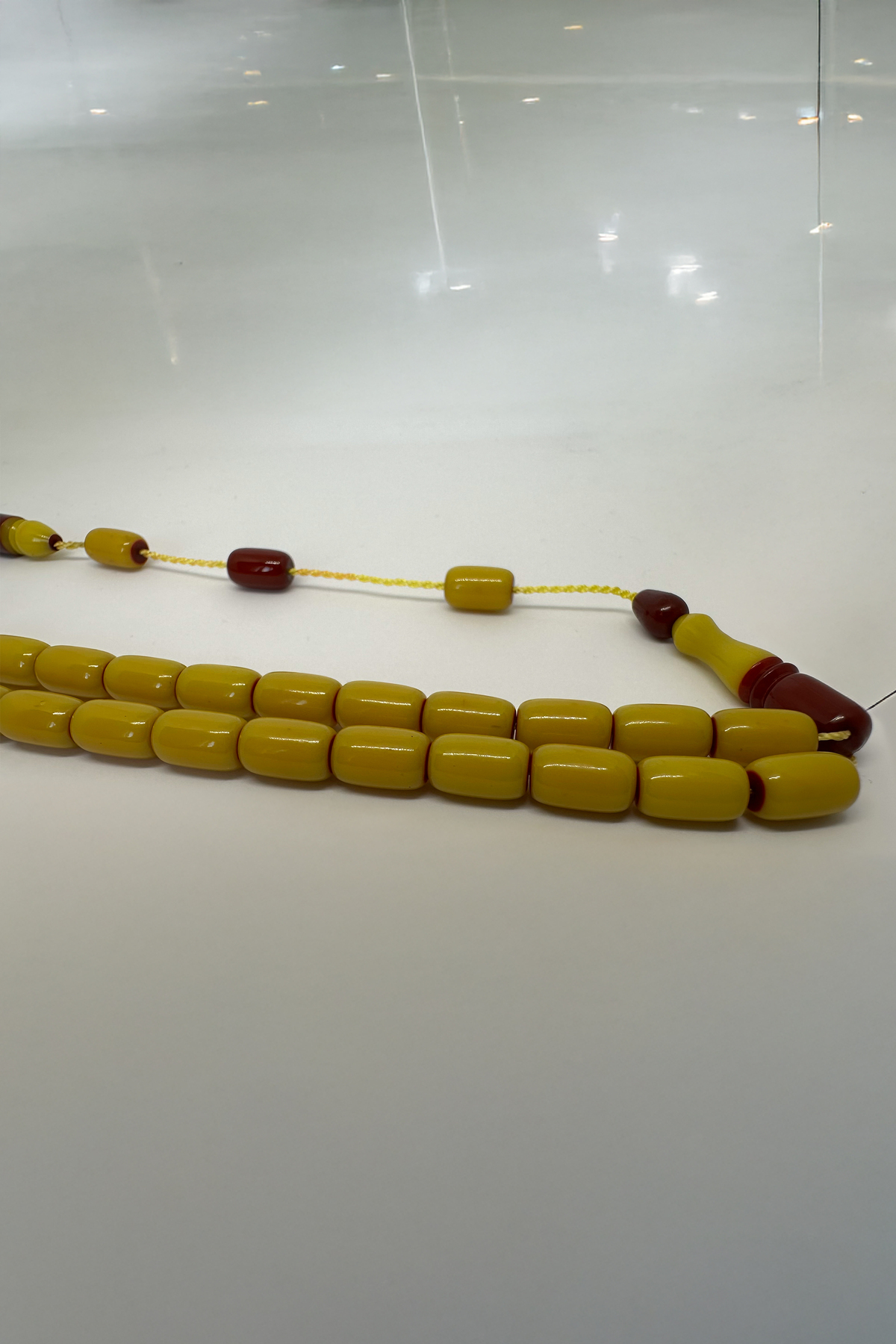 Osmanlı zarafetini modern ustalıkla birleştiren bu özel tesbih, koleksiyon meraklıları ve günlük kullanım için ideal bir seçenektir.; El işçiliği ile şekillendirilmiş olan bu tesbih, fırın sıkma kehribar materyalinden üretilmiş ve patin işlemesi ile klasik Osmanlı estetiğine yakın bir görünüm kazandırılmıştır.; Sarı ve bordo tonlarının uyum içinde harmanlandığı bu model, hem görsel zenginlik sunar hem de elde çekim hissiyatı bakımından oldukça tatmin edicidir.; İmamede ve püskül detaylarında kullanılan koyu bordo geçişler, ürüne şıklık ve otantik bir hava katmaktadır.; Ürün Özellikleri: • Malzeme: Fırın sıkma kehribar (özel hamur) • İşleme: Patin Osmanlı benzetme • Renk: Zeytinyağı sarısı – bordo kombinasyon • Tane Şekli: Silindir (oval hatlı) • Tane Sayısı: 33 adet • İmame Uzunluğu: 3 cm (yaklaşık) • Çekim Özelliği: Yumuşak ve akışkan çekim hissi • Kullanım Alanı: Günlük kullanım, koleksiyon, hediye Neden Bu Tesbih? • Patin işleme ile elde edilmiş Osmanlı havası • Renk geçişlerinde özgün ve estetik tasarım • Koleksiyon değeri taşıyan nadir model • Hediye olarak şık ve anlamlı bir seçenek Kullanım Tavsiyesi: Uzun ömürlü kullanım için nemli ortamlardan uzak tutulması, kolonya ve parfüm gibi kimyasallardan arındırılarak muhafaza edilmesi önerilir.; Kargo ve Paketleme: Ürün özel kutusunda, hediye paketi seçeneğiyle birlikte, güvenli ve garantisi ile gönderilmektedir.