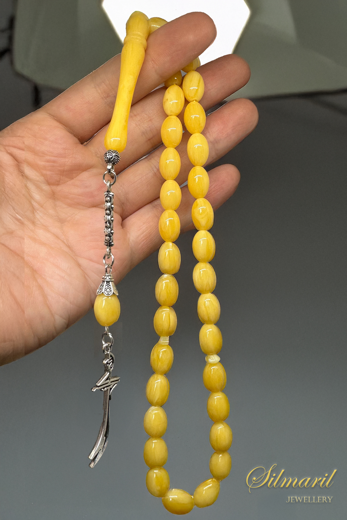 💛 Silmaril Jewellery kalitesiyle hazırlanan Damla Benzetme Tespih 33’lü (33 lük tesbih / 33’lü tesbih); canlı sarı damla tonu, parlak yüzeyi ve elde akıp giden formuyla ilk bakışta “işte bu!” dedirten bir duruş sunar. ✨ Eğer damla tespih, damla tesbih, beyrut damla benzetme, kehribar görünümlü tesbih veya damla görünümlü tespih arıyorsanız; bu model hem günlük kullanım hem de şık hediye için tam kararında bir seçimdir.