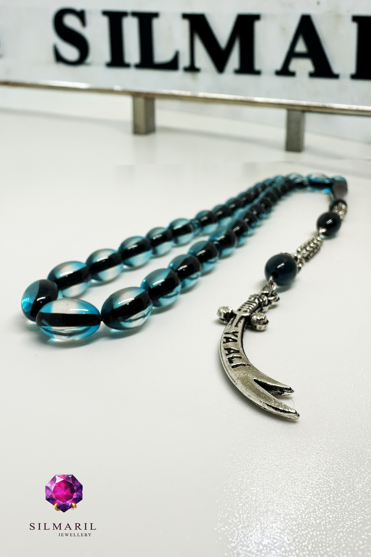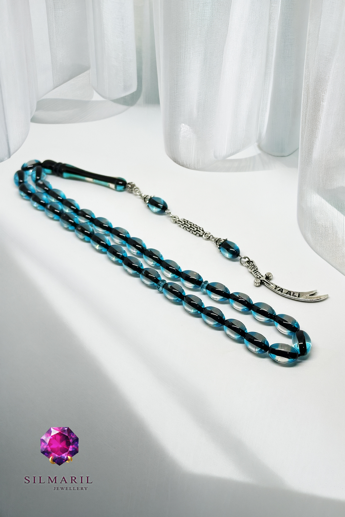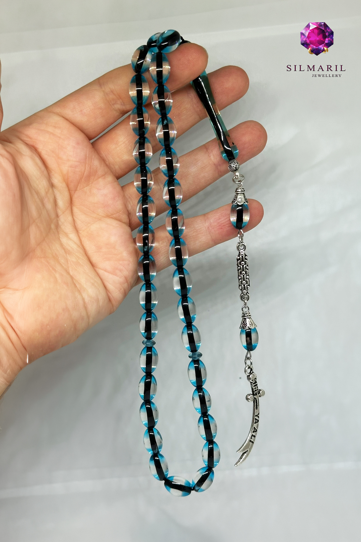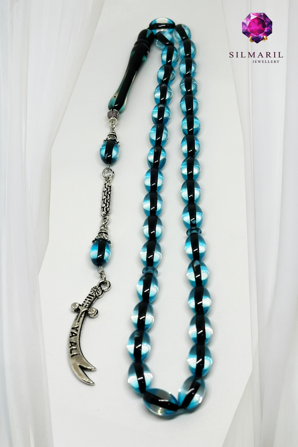 Özel Kesim ve Sistemli Dizim Ürünümüz standart 33’lü dizilime sahiptir (Ayrıca 99’lu, 17’li, 33 habbe ve 99 habbe kullanım alışkanlıklarına ilham veren standartlardadır). İdeal habbe ölçüsü (8x12 ölçülerine yakın hissiyatıyla), özel kesim teknikleriyle oval habbe, arpa kesim, kapsül kesim ve küre kesim formlarının ergonomisini sunar. Sistemli dizim ve düzgün dizim sayesinde çekim kalitesi en üst düzeydedir. Tasarım; özel imame ve klasik imame yapısından aşağı süzülen özel püskül, zincir püskül ve gümüş renk detay barındıran metal püskül ile zenginleştirilmiştir. Püskül ucunda yer alan zülfikar uç, ya ali yazılı figür ve para/figür uç detayları bu eşsiz tesbihe derin bir kimlik katar.